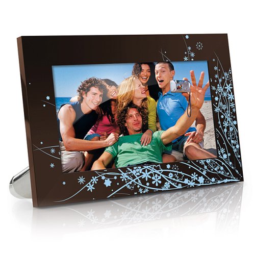 I bought this digital picture frame as a gift for my wife because I knew she would like the brown and blue design on it. And the aesthetic design is by far the best feature of this item. The rest of the frame is fairly mediocre. Due to the low resolution, pictures look quite pixelated if viewed from any closer than a few feet away. Also, when I formated several pictures to the advertized resolution of 480x234, I noticed that there were black spaces on the top and bottom. Using the 16:9 aspect ratio, I later tried formating pictures to 480x270, which removed the problem. A final note on resolution: most cameras take photos with an aspect ratio of 4:3, which means that pictures must be heavily cropped or stretched to fit properly on this display. Many of the pictures I had weren't suitable because the target image would be too cropped to look correct on the widescreen frame. And pictures that were taken in a portrait (tall) mode would appear very small on the frame with large black bars on the sides. (Although with some effort you can compose two portrait pictures side-by-side with resolutions of 240x270 each.)